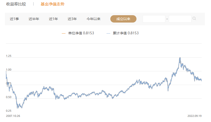 截至2022年9月19日,基金单位净值仅为0.8153元。此外,过去的近十五年间,基金从未分过红,这意味着成立时认购的投资者,若期间没有申赎持有至今,亏损仍超过一成。