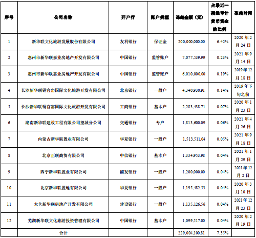 今年4月份,新华联文旅曾公告一张被查封冻结清单,涉及被查封冻结资产约45.04亿元,占最近一期经审计总资产8.94%,其中被冻结资金2.4亿元,被查封、冻结存货等其他资产42.64亿元。