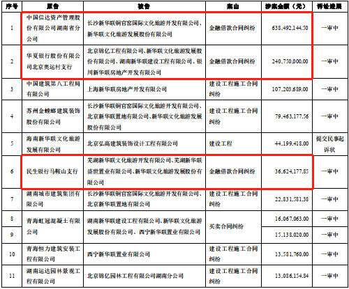 截至去年底,新华联文旅手上未解决诉讼涉及金额预计13.96亿元,包括信达资产、华夏银行、中建八局、金螳螂、民生银行等13笔诉讼案。