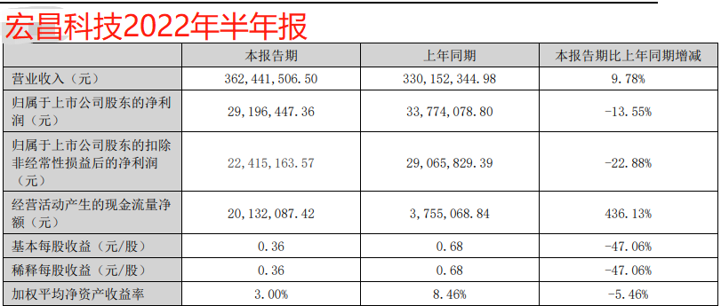 2022年上半年,宏昌科技的业绩仍然差强人意,营业收入同比增长9.78%,净利润和扣非净利润分别下降了13.55%和22.88%,加权平均净资产收益率从去年同期的8.46%下降到3%。