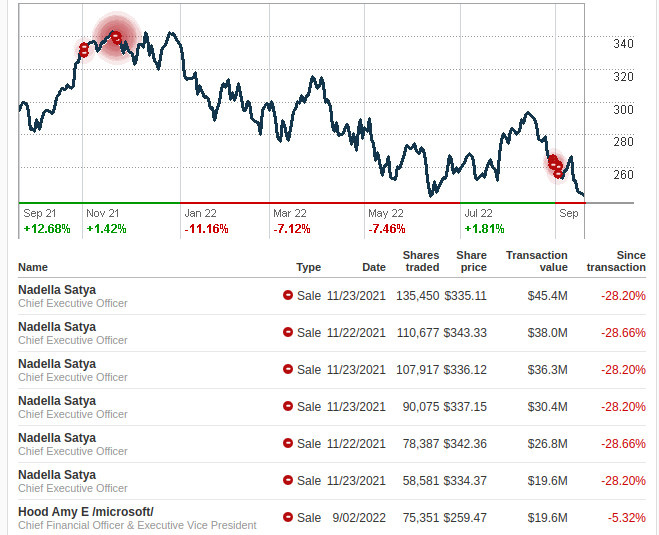 12 月的会议将由微软首席执行官萨蒂亚・纳德拉、首席财务官艾米・胡德、总裁布拉德・史密斯和微软首席独立董事约翰・汤普森举行。有趣的是,CNN 财经在微软股票页面上的内幕交易标签显示,纳德拉和胡德都在去年底和今年年初出售了价值数百万美元的股票,而且价格要高得多。