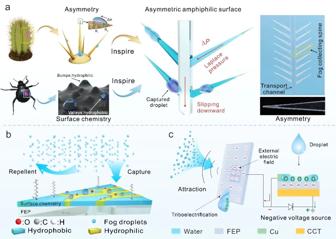 缩刺仙人掌是极少数适合在极度干旱地区生长的植物之一,除了通过将叶子退化为针以避免水分的蒸发和流失,其针刺还具有主动收集雾以提供外源水分补充的作用。此外,纳布尔沙漠甲虫同样可以从稀薄的空气中获取水分。通过背部鞘翅表面的亲水-疏水图案。亲水区捕捉水雾,液滴凝聚增大后转移至疏水区,疏水区的低表面能使大液滴从鞘翅表面快速去除。受到这两种生物精致结构和巧妙机制的启发,研究人员设计了一种双重仿生水雾收集表面。