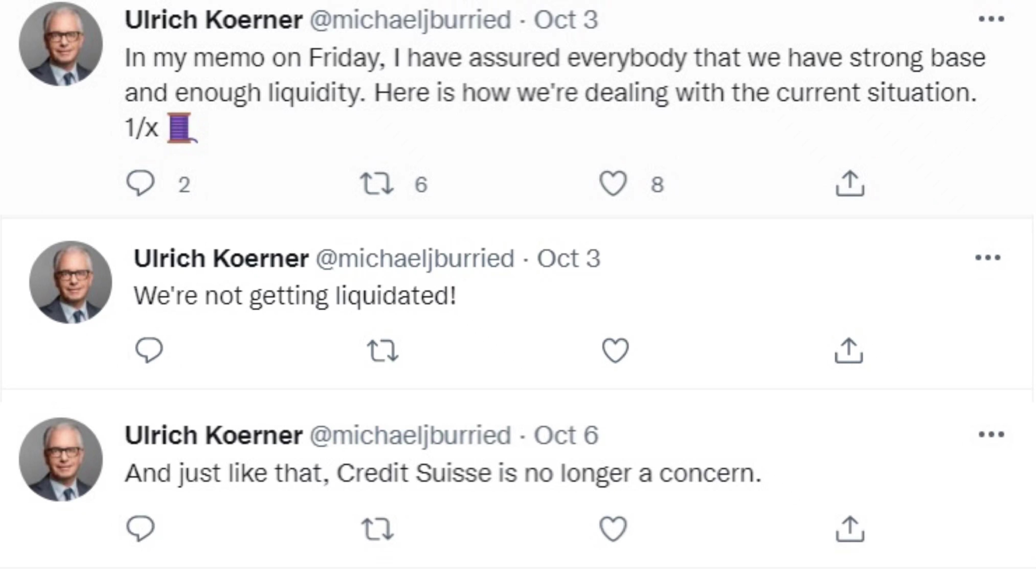尽管近日瑞士信贷首席执行官Ulrich Koerner频繁发推,强调瑞信财务状况良好并且拥有足够的流动性,但目前种种消息显示,无论瑞士信贷是否会宣布“破产”,其处境确实不容乐观。