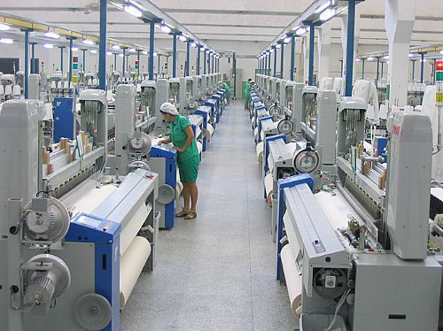 6. 喷水织机:通过喷射水柱,牵引纬纱穿越梭口的无梭织机,转速快,产量高。