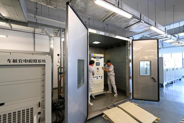 9月14日,在中汽中心新能源汽车科技创新基地充电技术部,工作人员测试某款新能源车型充电兼容性能。