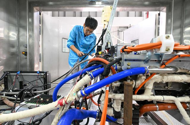 9月14日,在中汽中心新能源汽车科技创新基地燃料电池部,工作人员准备进行氢燃料电池发动机环境适应性试验。