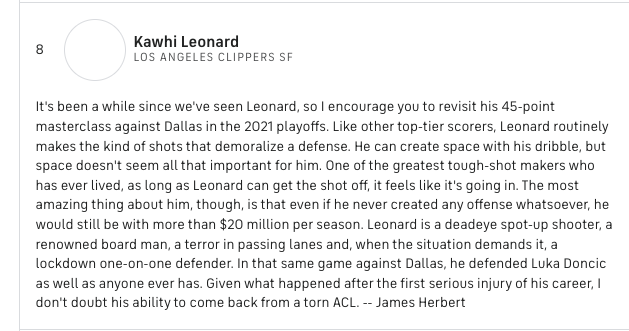 没想到,伤病不期而至。尽管如此,休息了一整个赛季之后,美媒CBS体育对新赛季球员的排名中,小卡依然排在第八,相比去年,还上升了一位。